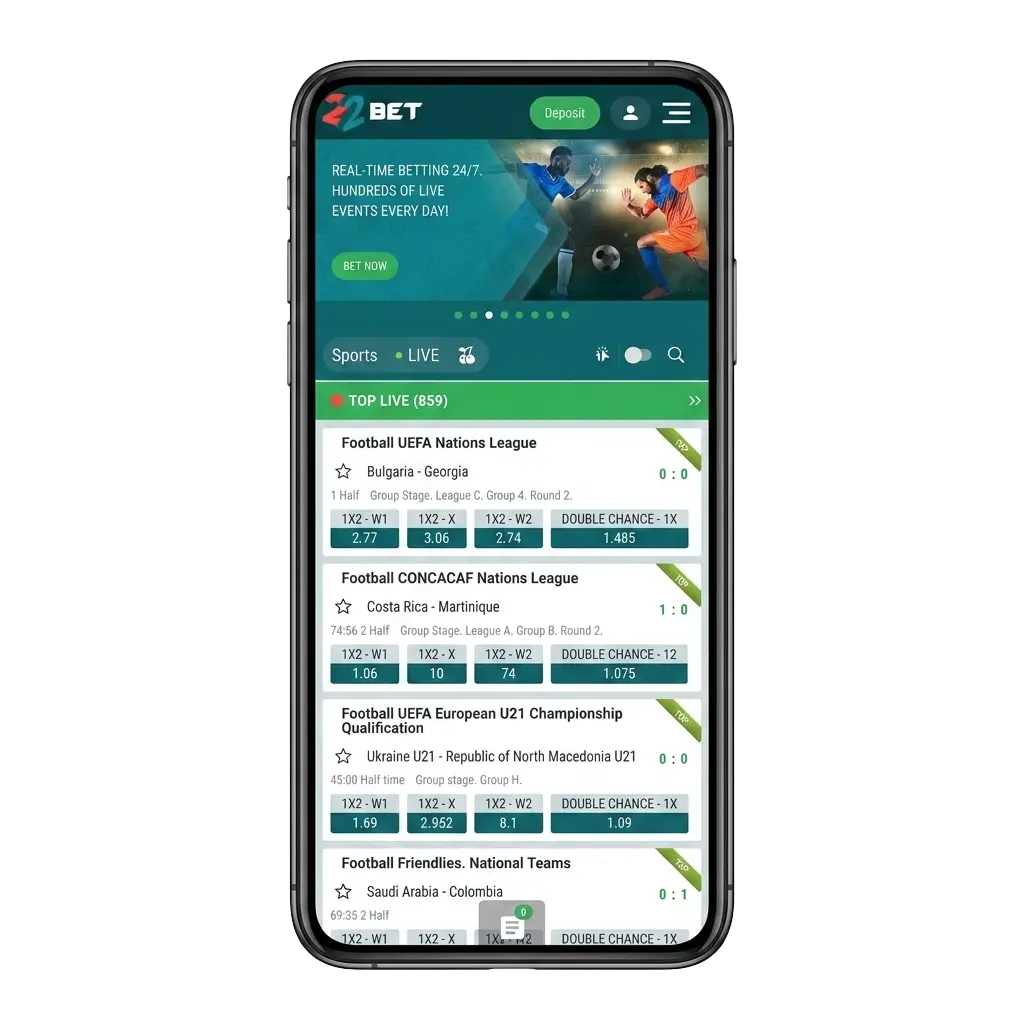 Open 22Bet through our site or go directly to the 22Bet website on your Android browser.